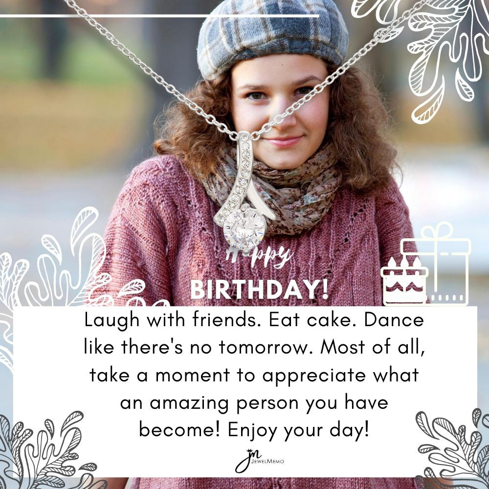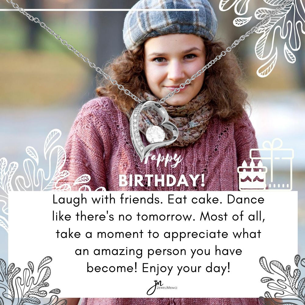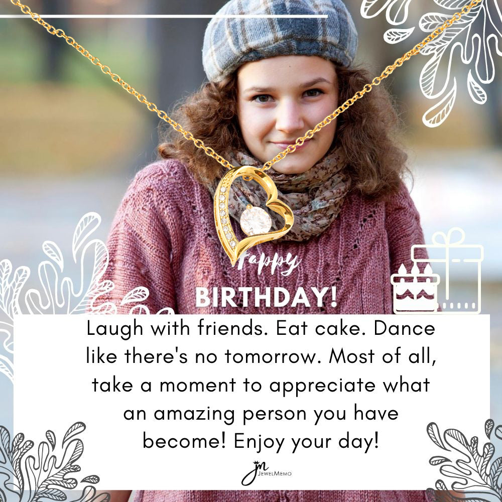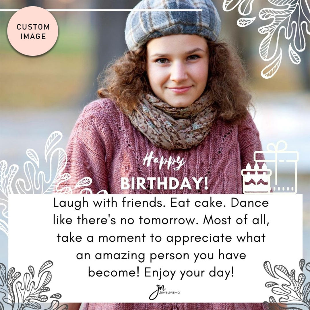 "Laugh with friends. Eat Cake. Dance like there's no tomorrow. Most of all, take a moment to appreciate what an amazing person you have become! Enjoy your day!"