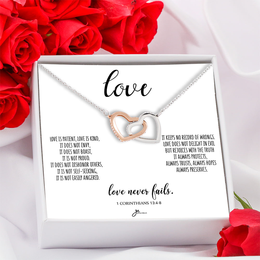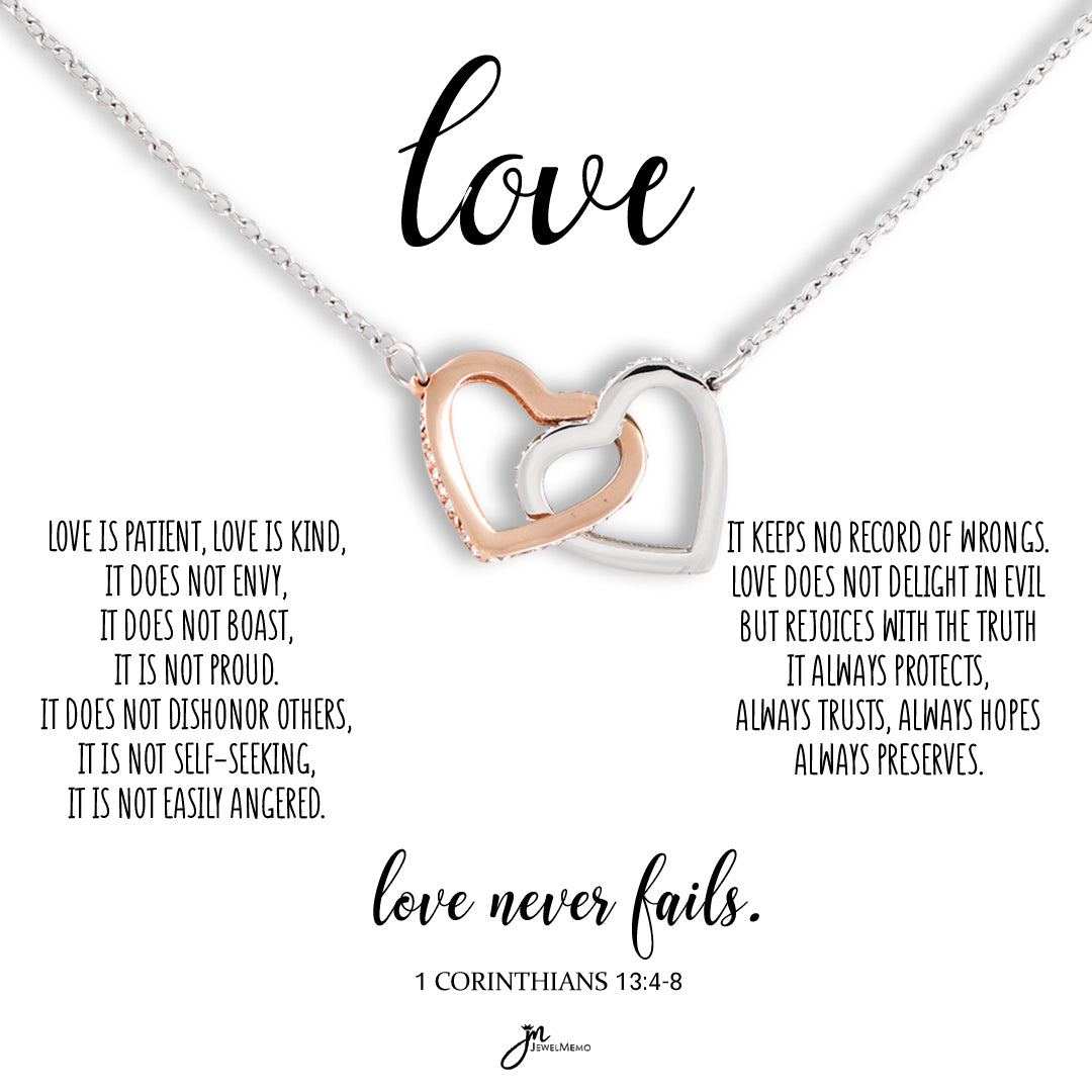 "Love is patient, love is kind. It does not envy, it does not boast, it is not proud. It does not dishonor otherss, it is not self-seeking, it is not easily angered, it keeps no record of wrongs. Love does not delight in evil but rejoices with the truth. It always protects, always trusts, always hopes, always perseveres, love never fails"
