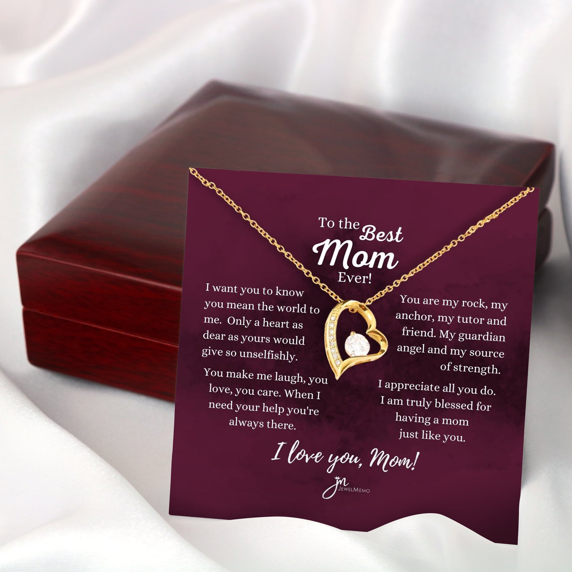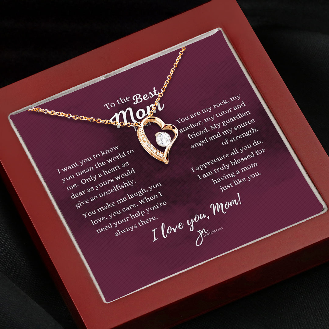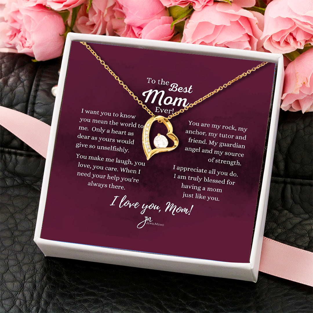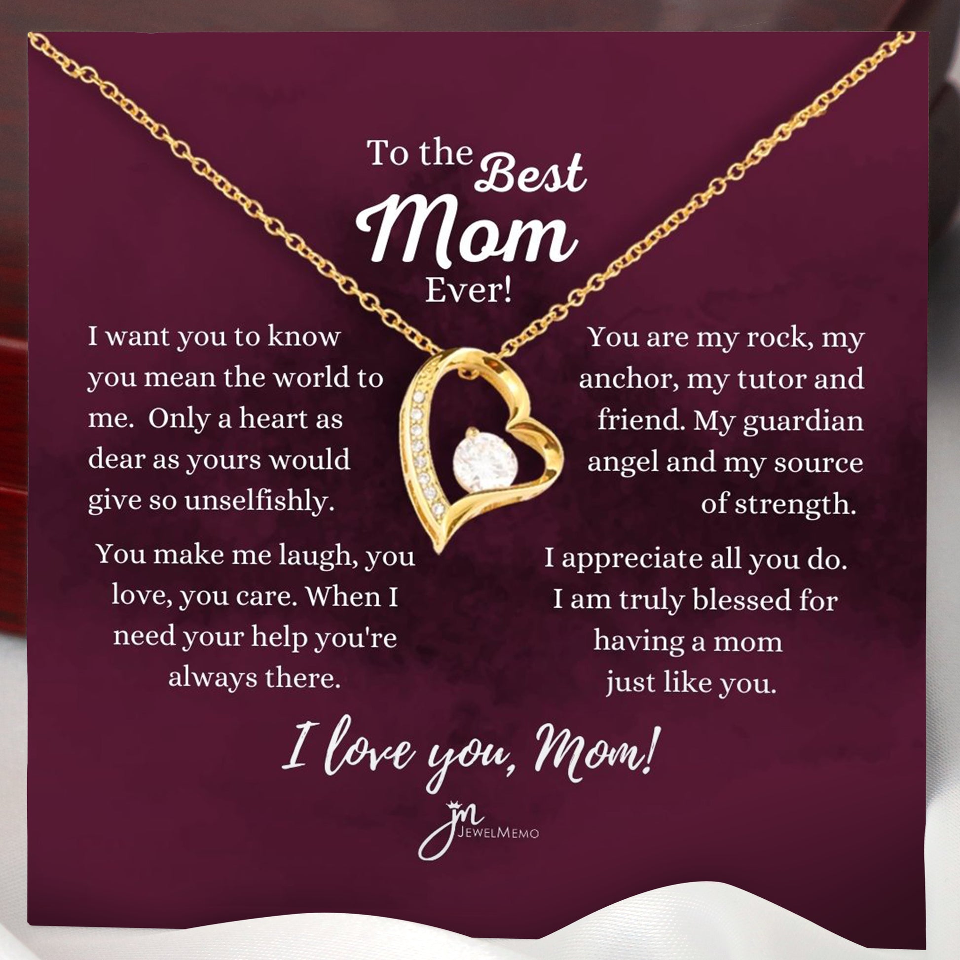 "I want you to know you mean the world to me. Only a heart as dear as yours would give so unselfishly. You make me laugh, you love, you care. When I need your help you're always there. You are my rock, my anchor, my tutor and friend. My guardian angel and my source of strength. I appreciate all you do. I am truly blessed for having a mom just like you. I love you, Mom!"