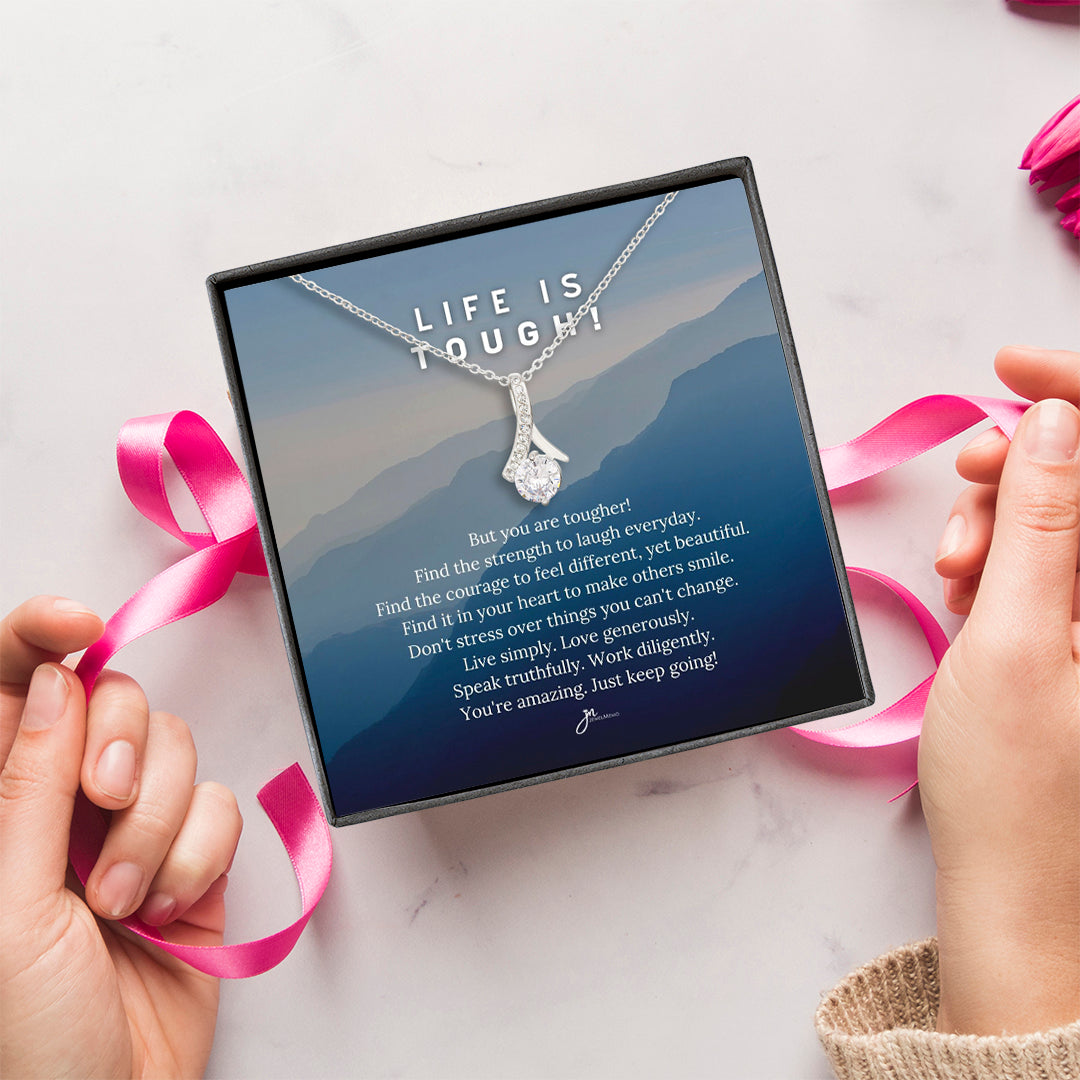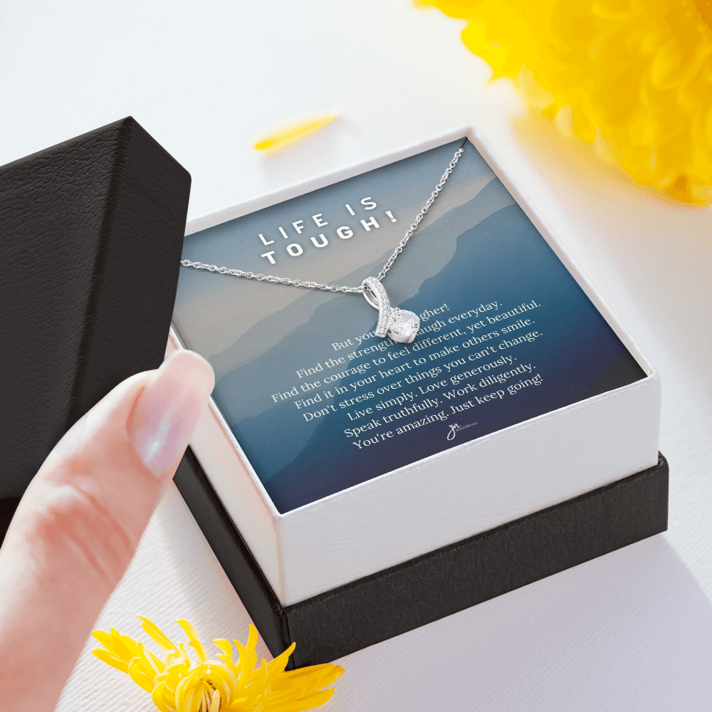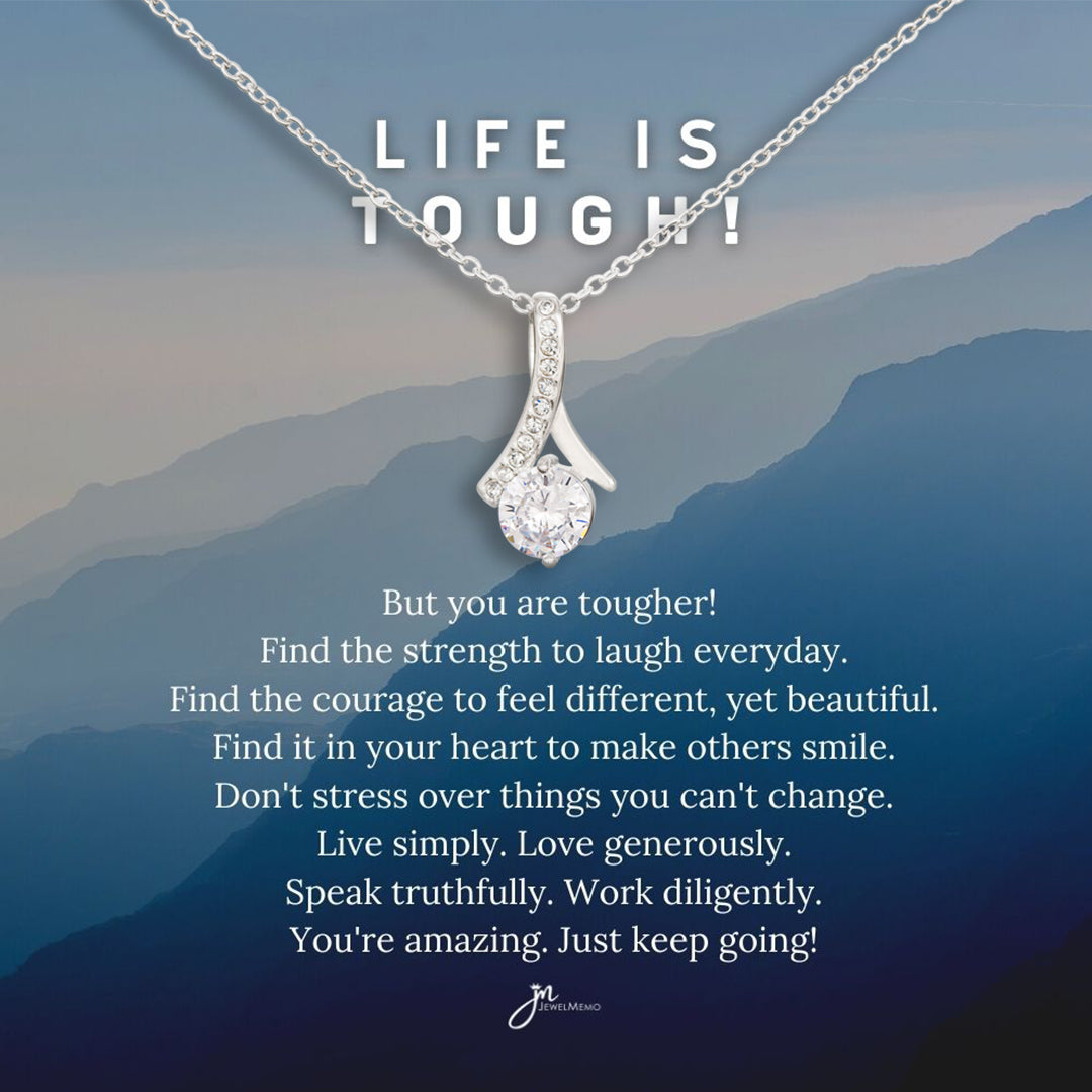 "Life is tough but you are tougher! Find the strength to laugh everyday. Find the courage to feel different yet beautiful. Find it in your heart to make others smile. Don't stress over things you can't change. Live simply, love generously, speak truthfully, work diligently. You're amazing. keep going!"
