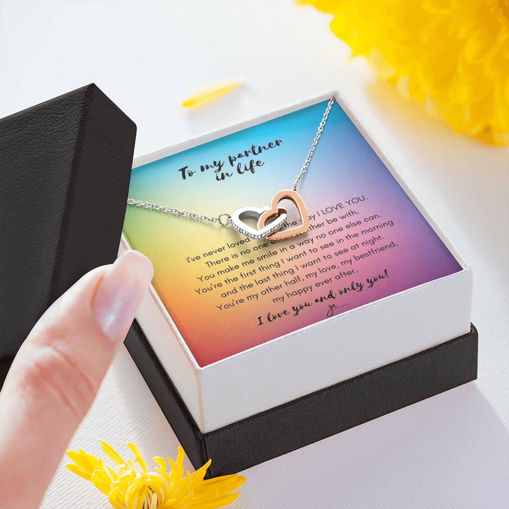 Two hearts embellished with Cubic Zirconia stones interlocked together as a symbol of never-ending love. Made with high-quality polished surgical steel. The cable chain measures 18 inches with a 4-inch extension and fastens with a lobster clasp.