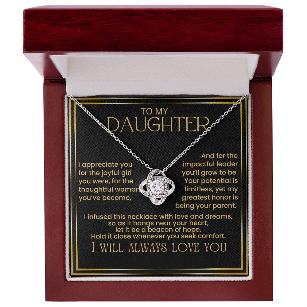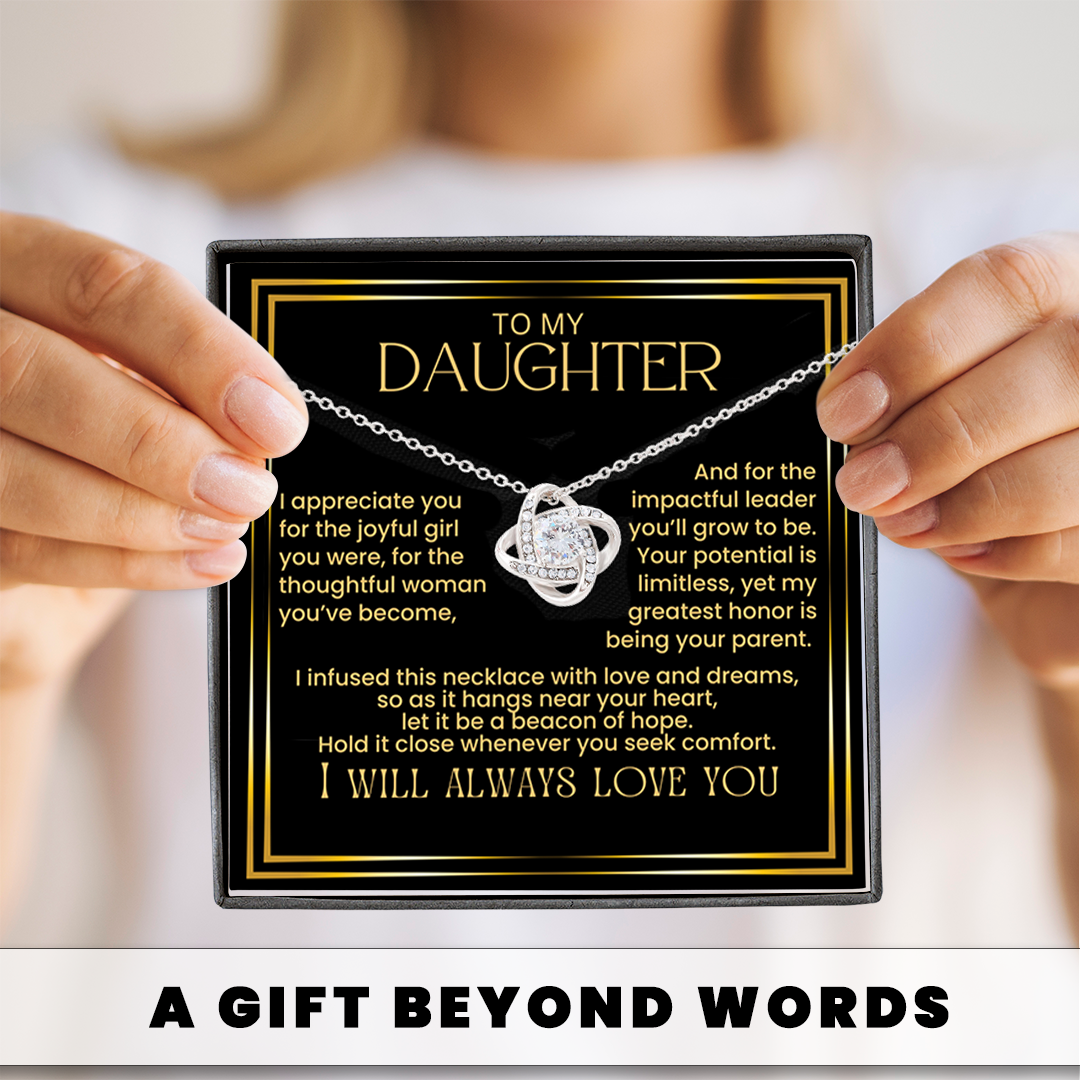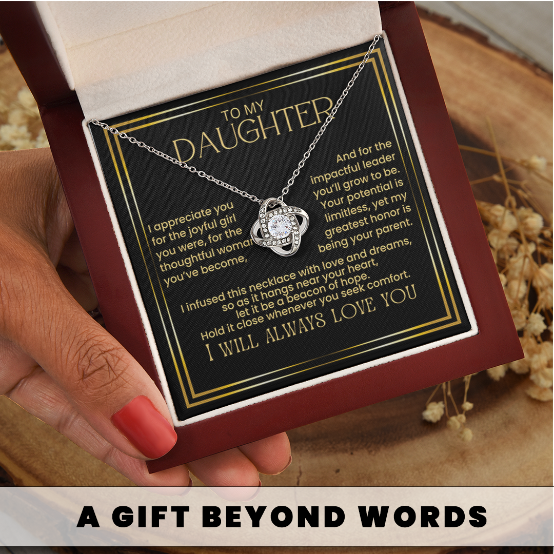 I appreciate you for the joyful girl you were, for the thoughtful woman you’ve become, and for the impactful leader you’ll grow to be. Your potential is limitless, yet my greatest honor is being your parent. I infused this necklace with love and dreams, so as it hangs near your heart, let it be a beacon of hope. Hold it close whenever you seek comfort.