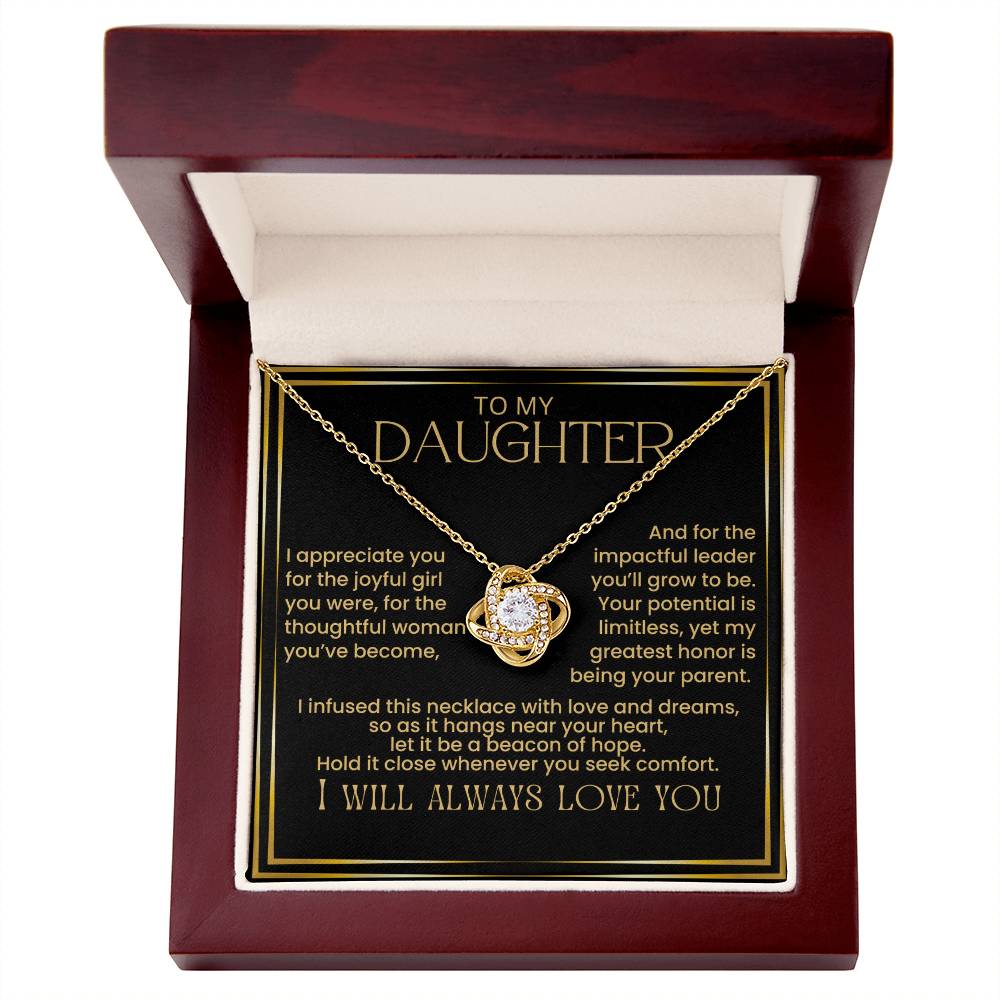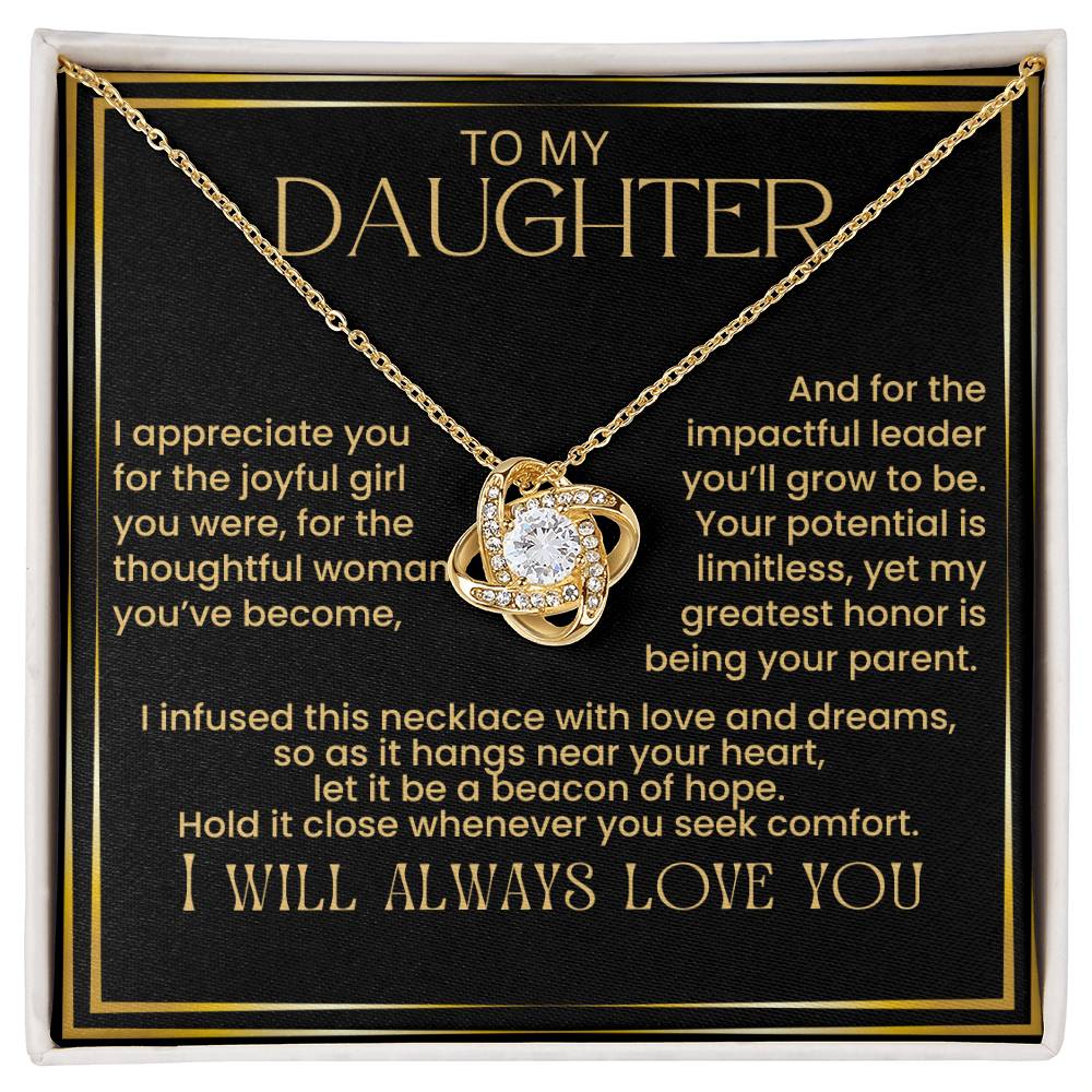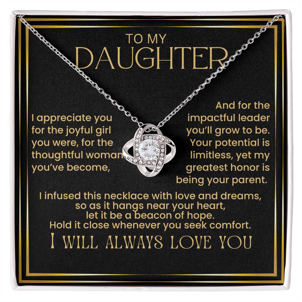 I appreciate you for the joyful girl you were, for the thoughtful woman you’ve become, and for the impactful leader you’ll grow to be. Your potential is limitless, yet my greatest honor is being your parent. I infused this necklace with love and dreams, so as it hangs near your heart, let it be a beacon of hope. Hold it close whenever you seek comfort.