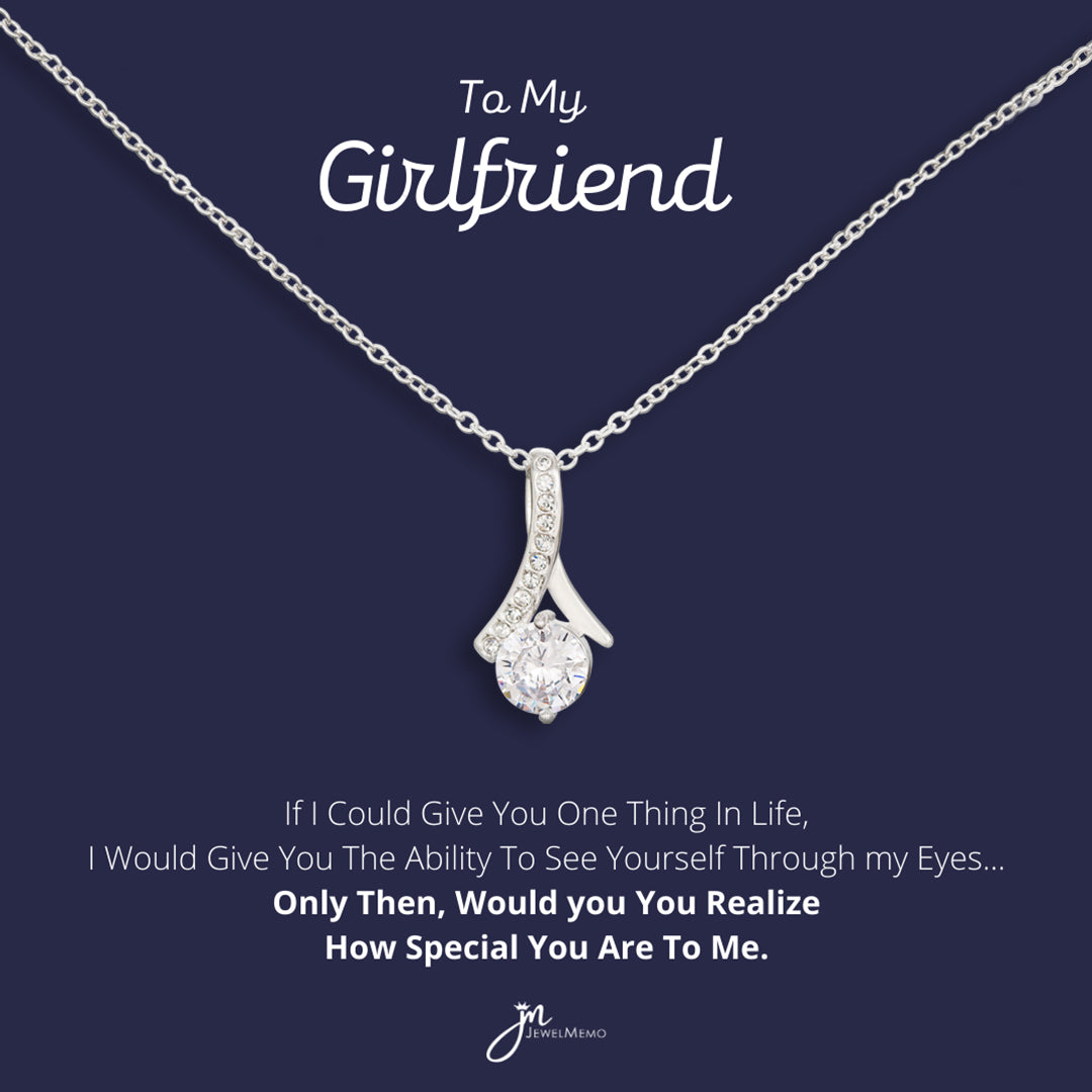Melt her heart with this ALLURING BEAUTY necklace gift! The petite ribbon shaped pendant is finished with 14K white gold over stainless steel, and is embellished with dainty clear crystals surrounded by a sparkling 7mm round cut Cubic Zirconia.