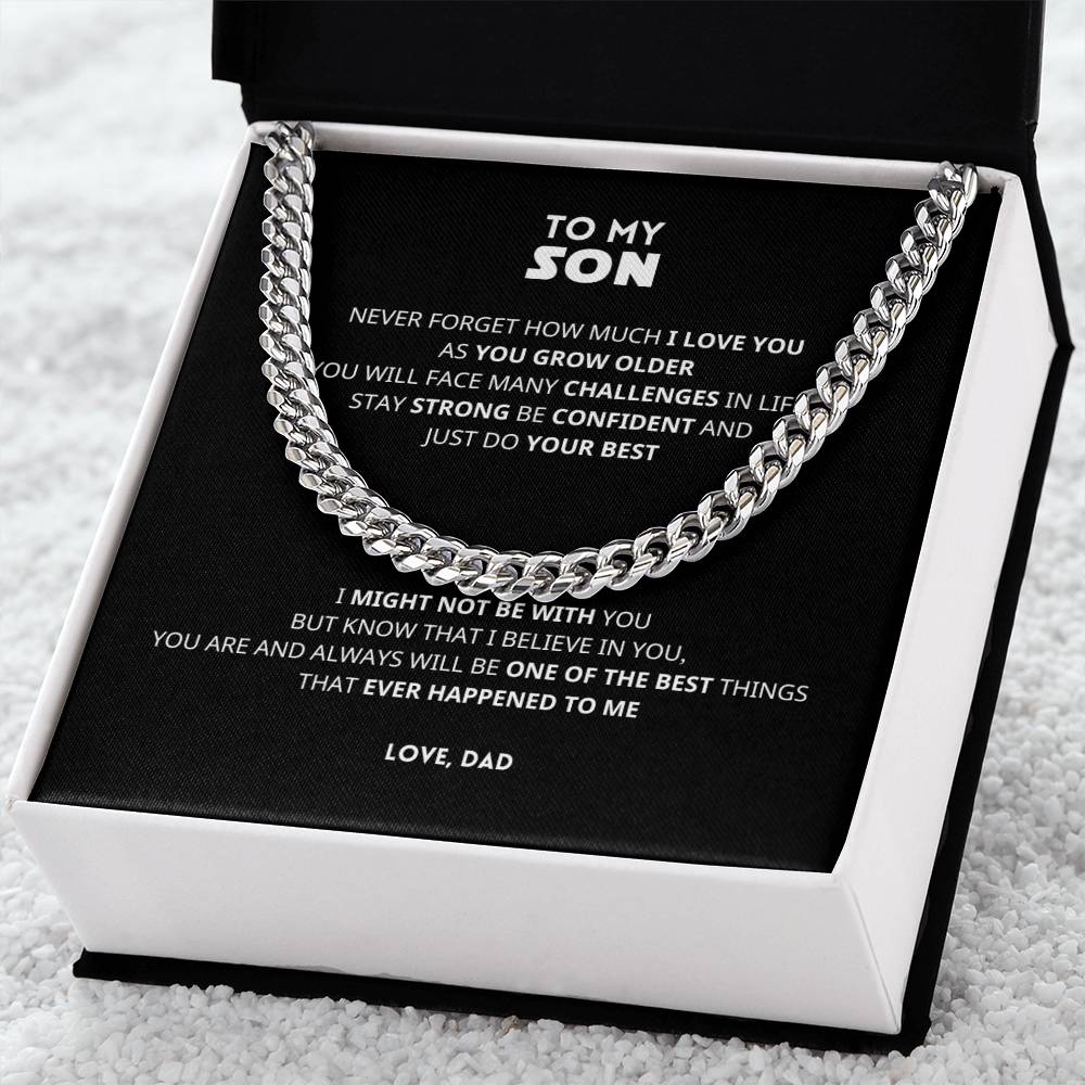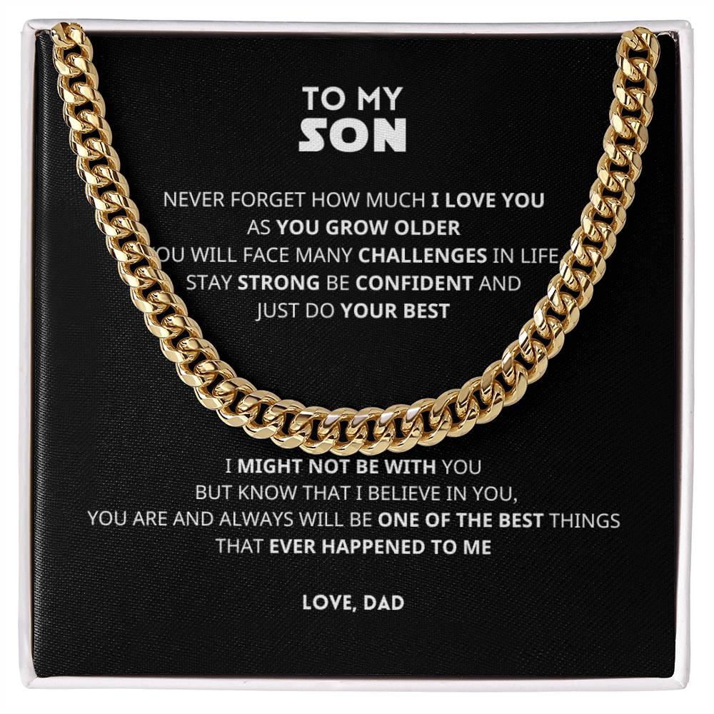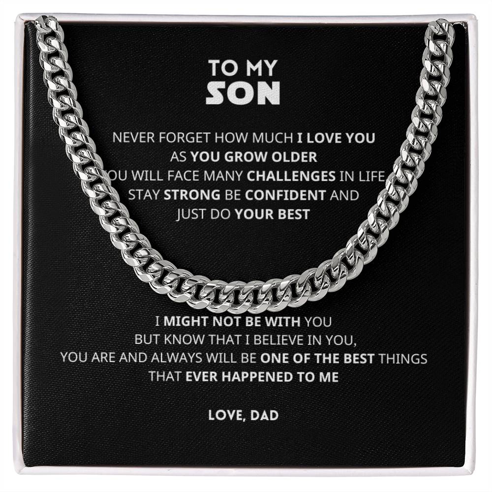 TO MY SONNEVER FORGET HOW MUCH I LOVE YOU AS YOU GROW OLDER YOU WILL FACE MANY CHALLENGES IN LIFE, STAY STRONG BE CONFIDENT AND JUST DO YOUR BEST. I MIGHT NOT BE WITH YOU BUT KNOW THAT I BELIEVE IN YOU, YOU ARE AND ALWAYS WILL BE ONE OF THE BEST THINGS THAT EVER HAPPENED TO ME