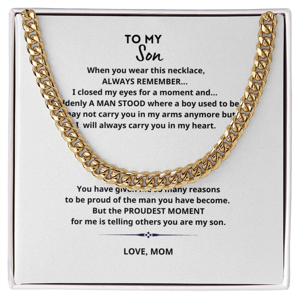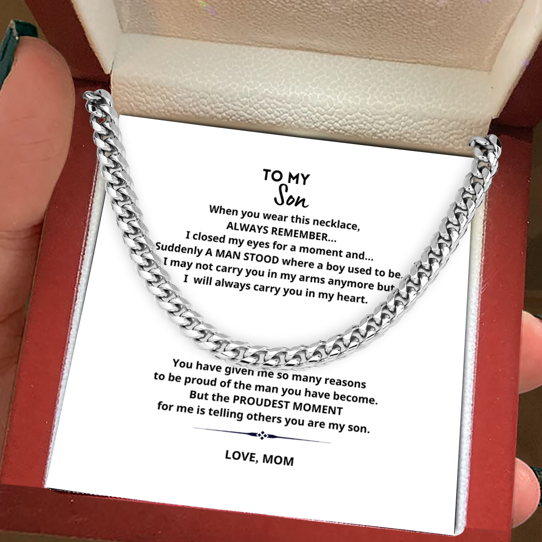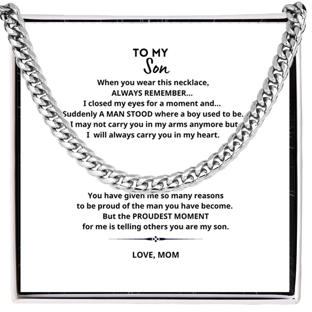 When you wear this necklace, ALWAYS REMEMBER... I closed my eyes for a moment and... Suddenly A MAN STOOD where a boy used to be. I may not carry you in my arms anymore but I will always carry you in my heart. You have given me so many reasons to be proud of the man you have become. But the PROUDEST MOMENT for me is telling others you are my son.