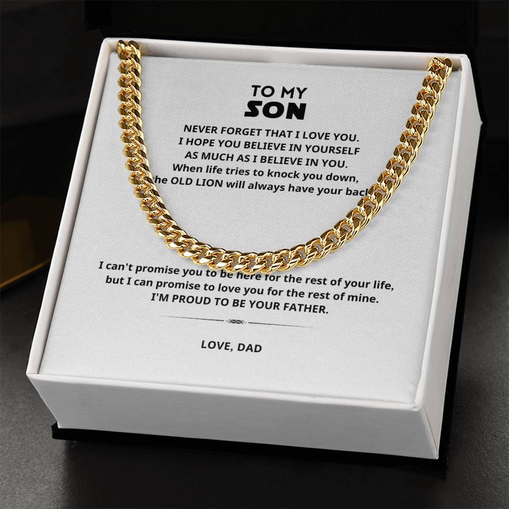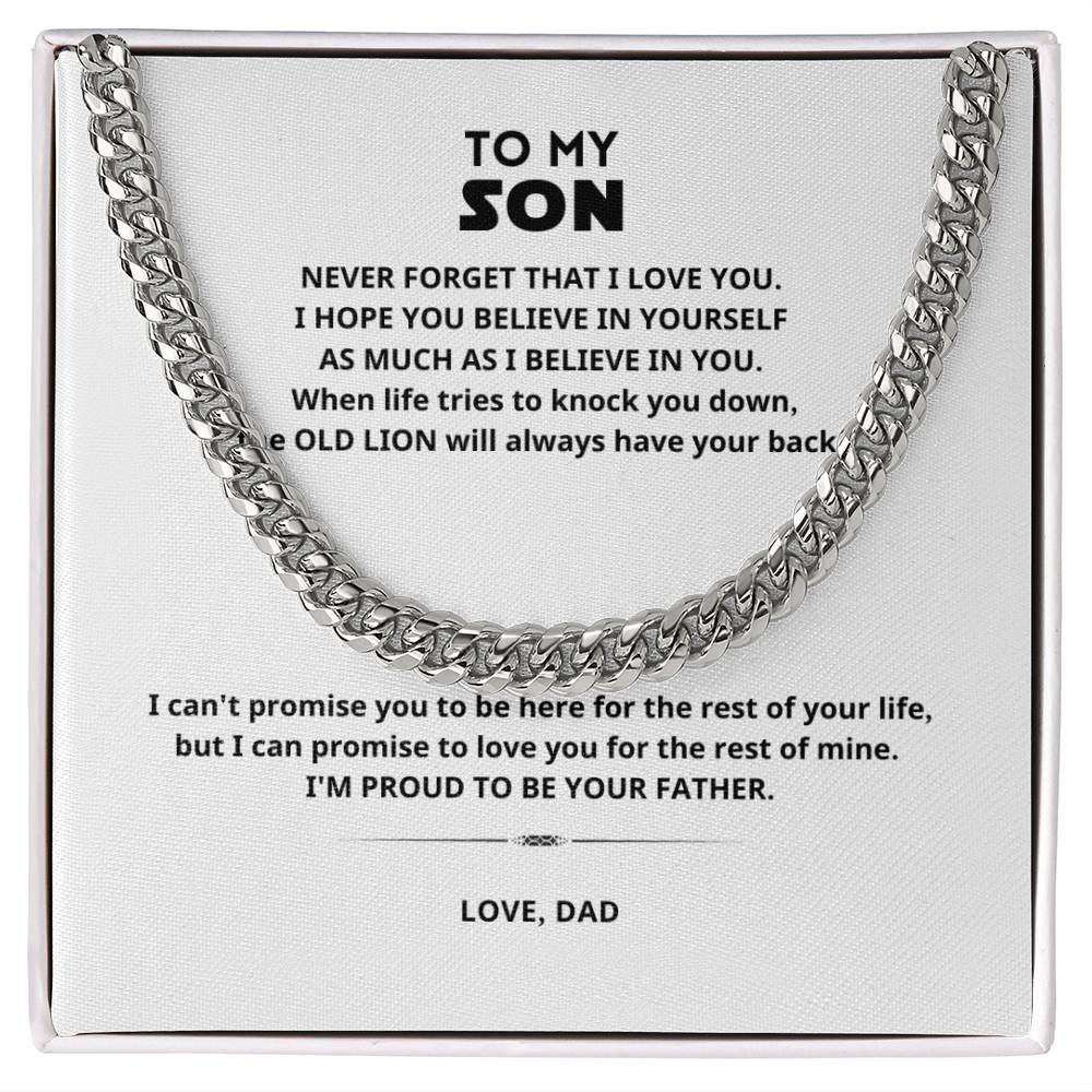 TO MY SONNEVER FORGET THAT I LOVE YOU. I HOPE YOU BELIEVE IN YOURSELF AS MUCH AS I BELIEVE IN YOU. When life tries to knock you down, the OLD LION will always have your back. I can't promise you to be here for the rest of your life, but I can promise to love you for the rest of mine. I'M PROUD TO BE YOUR FATHER.