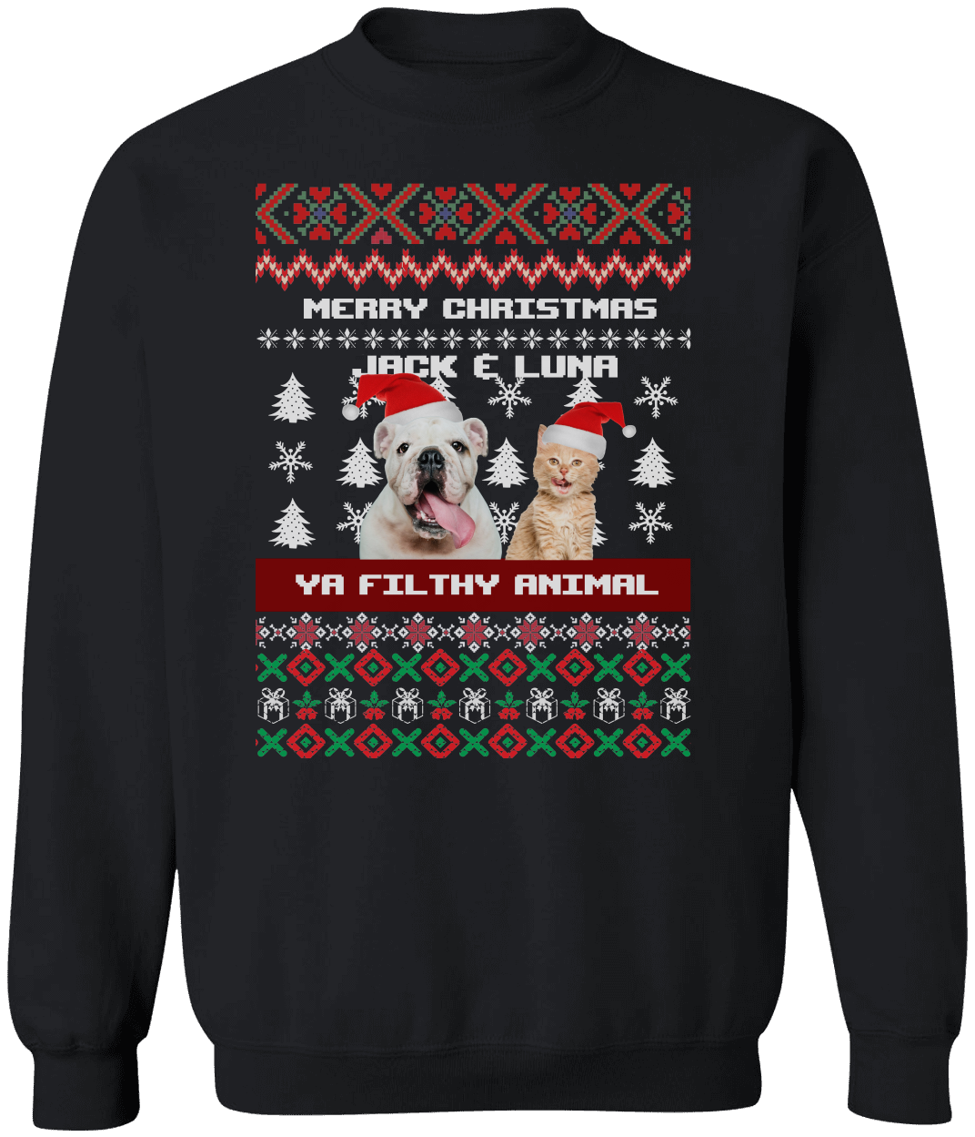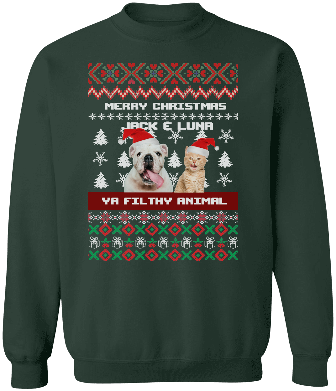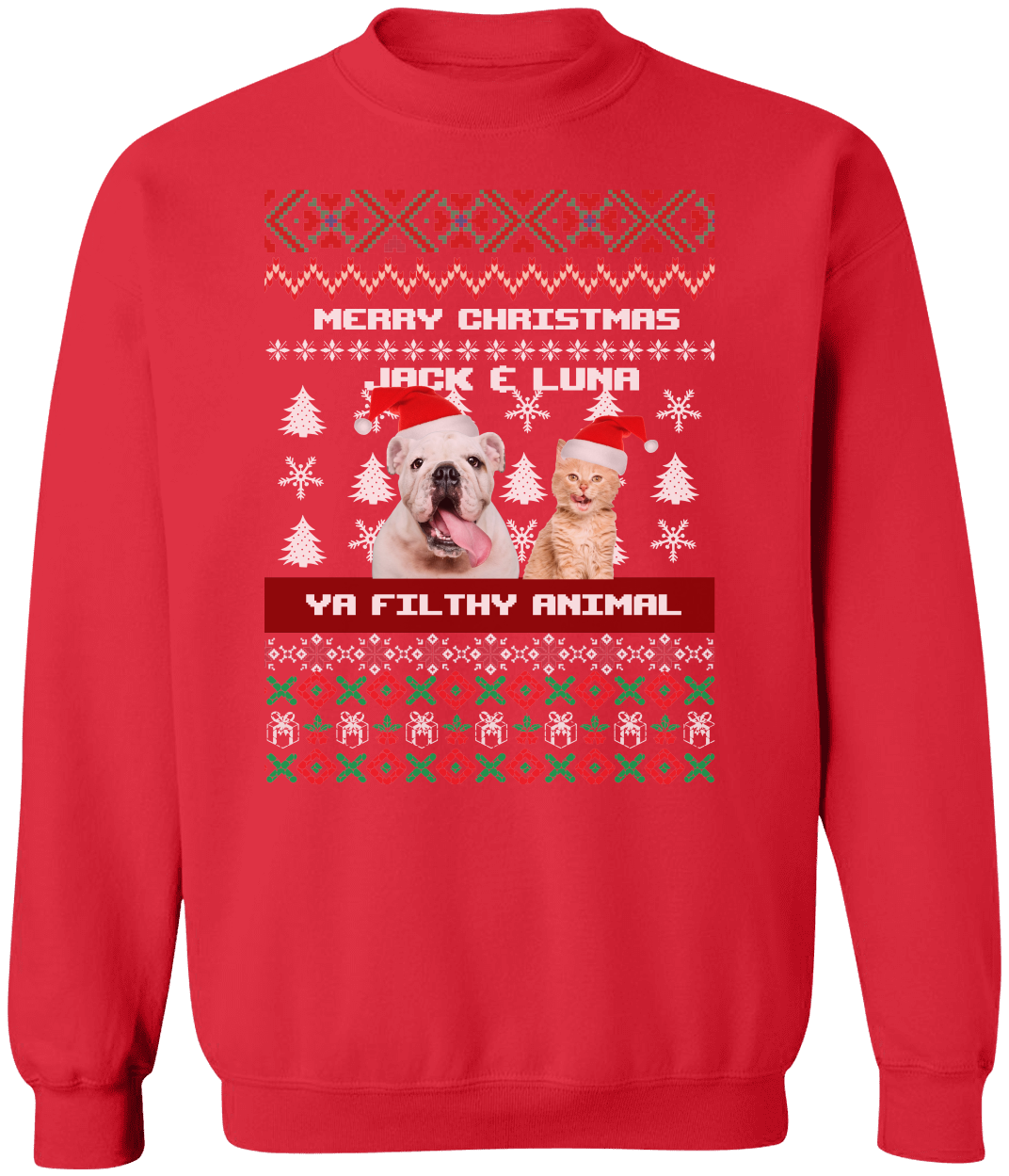 🎉 Spread Joy with a Personal Touch: Our Ugly Christmas Crewneck Sweater – Now Customizable! 🎄✨👕 Add a unique twist to holiday fun by uploading up to two pictures of your pets! Whether it’s the same pet or two different pets, this sweater is truly yours. Perfect for pet lovers, each crewneck combines festive cheer with your furry friends' adorable faces, creating a one-of-a-kind holiday statement. From classic designs to quirky holiday themes, this cozy sweater is made to bring laughter, warmth, and personal charm to every gathering. Celebrate the season in style and let your sweater be the ultimate holiday conversation starter! 🌟🥳🐾🎁. Get ready to be the center of holiday cheer with this Ugly Christmas Crewneck Sweater – unapologetically jolly and full of festive fun!